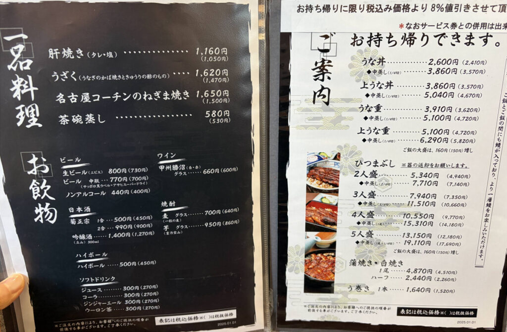 メニューは大きく「ひつまぶし」「うな丼」「うな重」に分かれていて、量や内容で段階が分かれています。