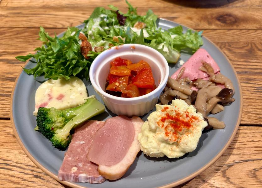 前菜プレートは、サラダにハムやスモークチキン、キノコのマリネ、ポテトサラダ、ラタトゥイユなど、少しずついろいろ味わえるスタイル。