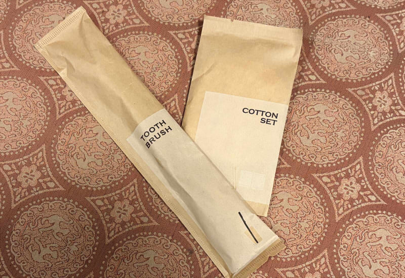洗面スペースには、歯ブラシやコットンなどのアメニティがありました。